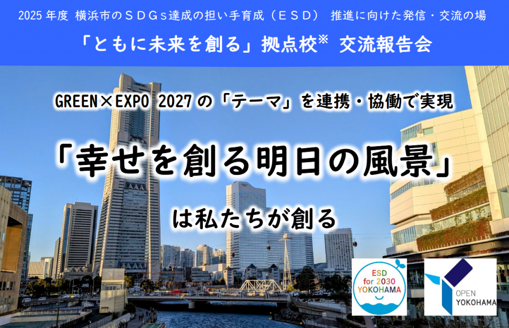 - 各校の教育活動を、連携・協働によって「ともに未来を創る」視点で振り返り、ESDの価値を再認識すると共に、意見交換を通して、テーマ「『幸せを創る明日の風景』(GREEN×EXPO2027)は私たちが創る」の実現に向けた今後の活動について、表現したり、考え深めたりする。
